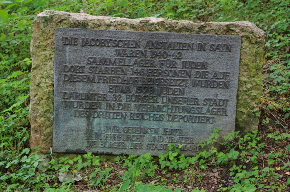 „DIE JACOBY’SCHEN ANSTALTEN IN SAYN WAREN 1940–1942 SAMMELLAGER FÜR JUDEN. DORT STARBEN 146 PERSONEN, DIE AUF DIESEM FRIEDHOF BEIGESETZT WURDEN.