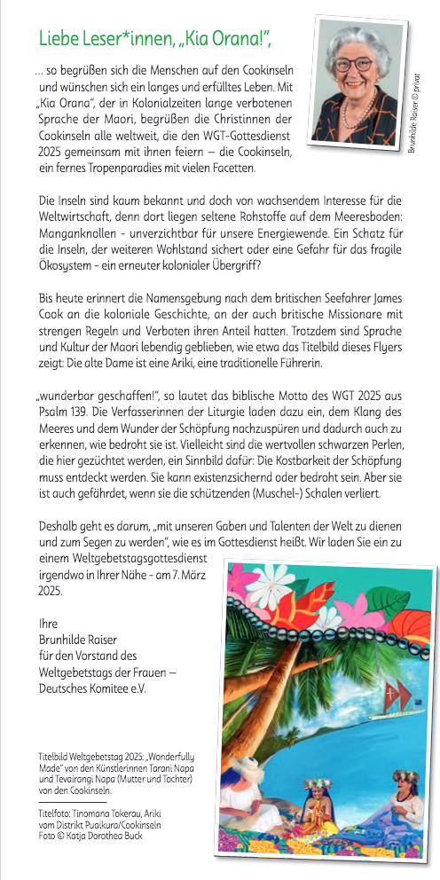 Christinnen der Cookinseln – einer Inselgruppe im Südpazifik, viele, viele tausend Kilometer von uns entfernt – laden ein, ihre positive Sichtweise zu teilen: wir sind „wunderbar geschaffen!“ und die Schöpfung mit uns.